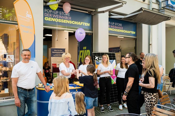 Der Pop-up-Store, mitten im Herzen der Weimarer Flaniermeile gelegen, bietet an den kommenden Sonnabenden jeweils einer oder mehreren Genossenschaften die Möglichkeit, ihre Arbeit, Werte und Angebote der Öffentlichkeit zu präsentieren. Am vergangenen Samstag war unsere Wohnungsgenossenschaft gemeinsam mit der Energiegenossenschaft Ilmtal e.G. im Laden vertreten. Die Präsentation war ein voller Erfolg. Neben vielen interessierten Gesprächen mit Passantinnen und Passanten erfreuten sich vor allem die kleinen Besucher an den bunten Aktionen wie Kinderschminken und Glitzertattoos. Vielen Dank an die Mitarbeiterinnen und Mitarbeiter unserer Genossenschaft, die den Stand unserer GWG vertaten. Sie trugen mit großem Engagement zur freundlichen Atmosphäre bei und verteilten farbenfrohe GWG-Luftballons, die überall in der Innenstadt zu sehen waren.